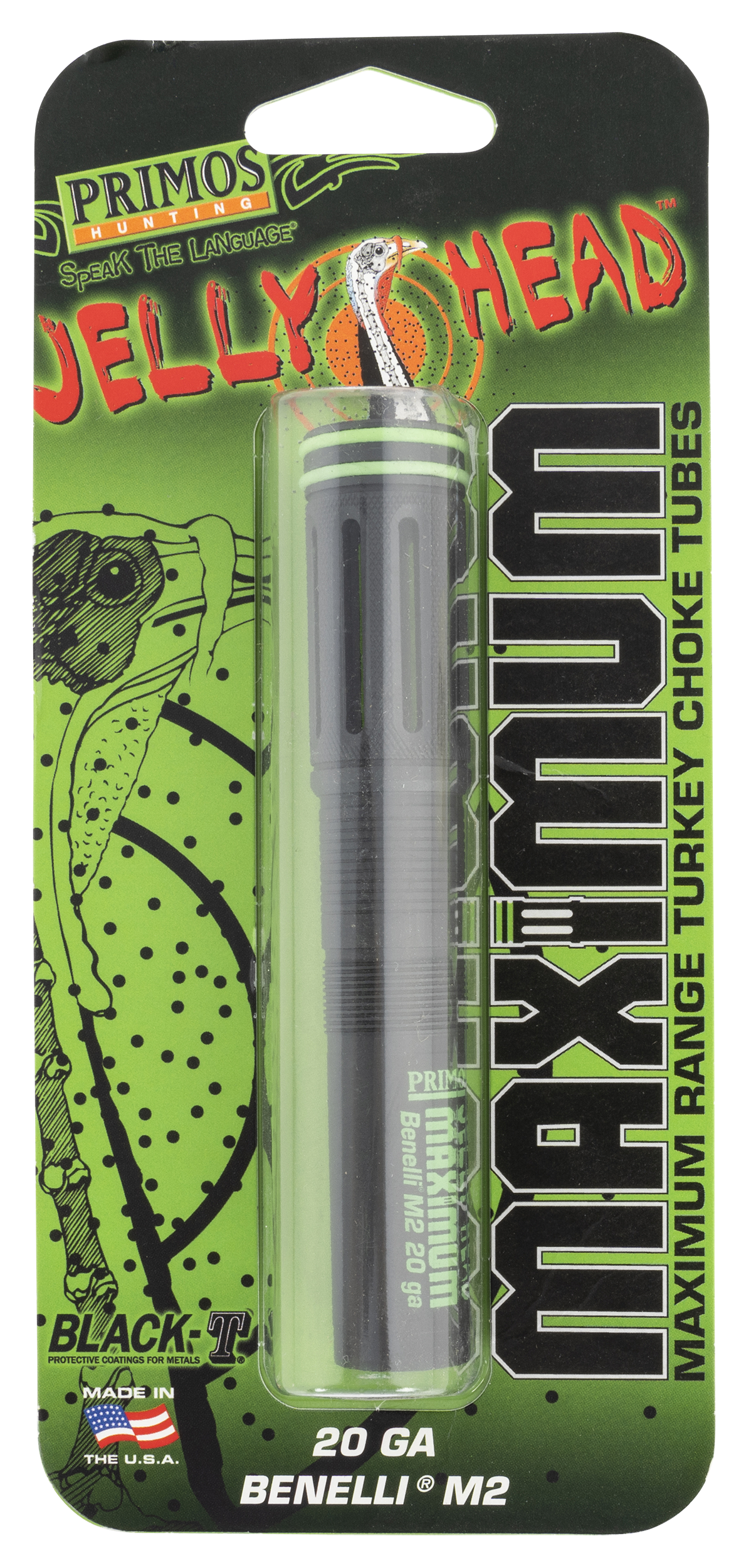 The jelly head maximum is designed to increase the range and pattern density of your favorite turkey gun! the jelly head maximum utilizes an extended taper and fluted ports to tighten patterns up to 20% and reduce recoil, allowing you to stop gobblers in their tracks at even longer ranges.Primos utilizes proprietary black-t coating, the same protective barrier utilized by the military's special forces to prevent rust and corrosion on weapons in the harshest environments, like turkey hunting.Designed to shoot hevi-shot, copperplated lead or regular lead.90% pattern density at 40 yards.