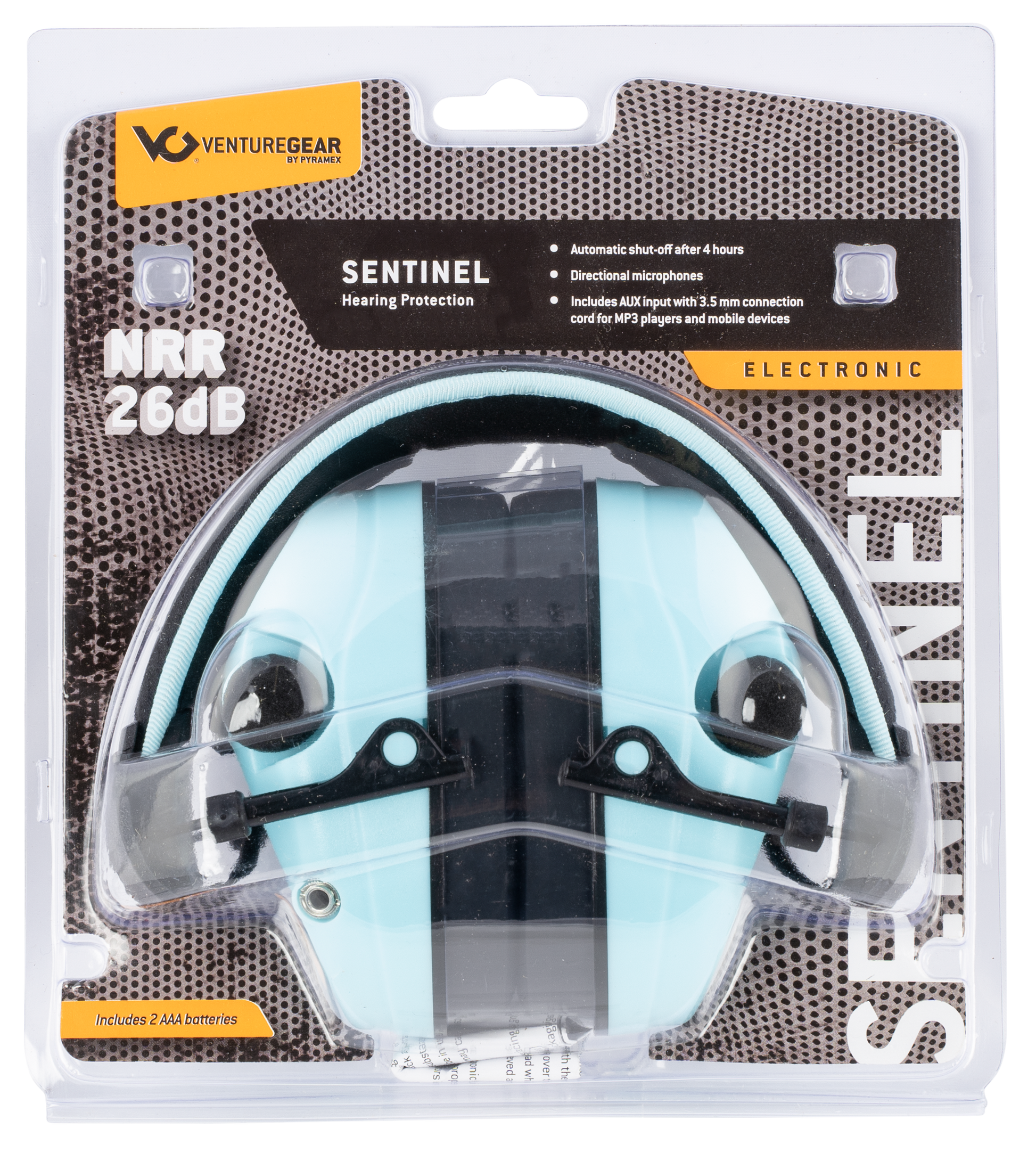 Pyramex's venture gear sentinel electronic earmuff features slim profile ear cups, fold-away, padded headband, and a front facing microphone.The muff helps amplify hearing, while compressing harmful sounds and reducing them to a safe level.It also has an auto shut-off after four hours, 3.5 mm aux jack for use of mp3 and mobile devices, and height adjustment to fit all sizes.