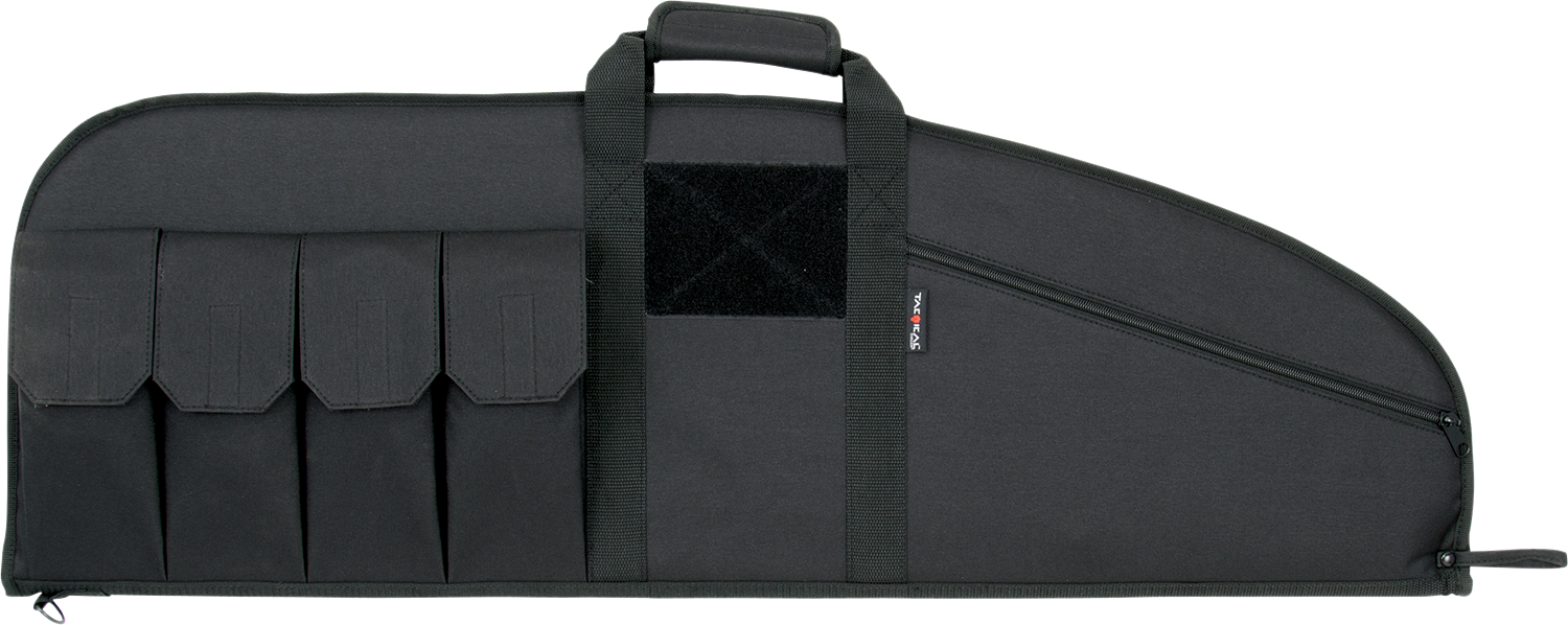 The combat tactical rifle case from allen tactical fits tactical rifles with or without scopes.Features four magazine pockets with hook and loop closures, plus a large zippered accessory pocket that fits targets, gloves, ammo and other accessories.A large 5.25" x 4.25" hook and loop patch is perfect for adding morale and name patches.The exterior of the case is heavy-duty endura fabric and the inside of the case has a soft knit lining and thick foam padding to protect your firearm.Includes durable web handles with a padded handle grip and is lockable.