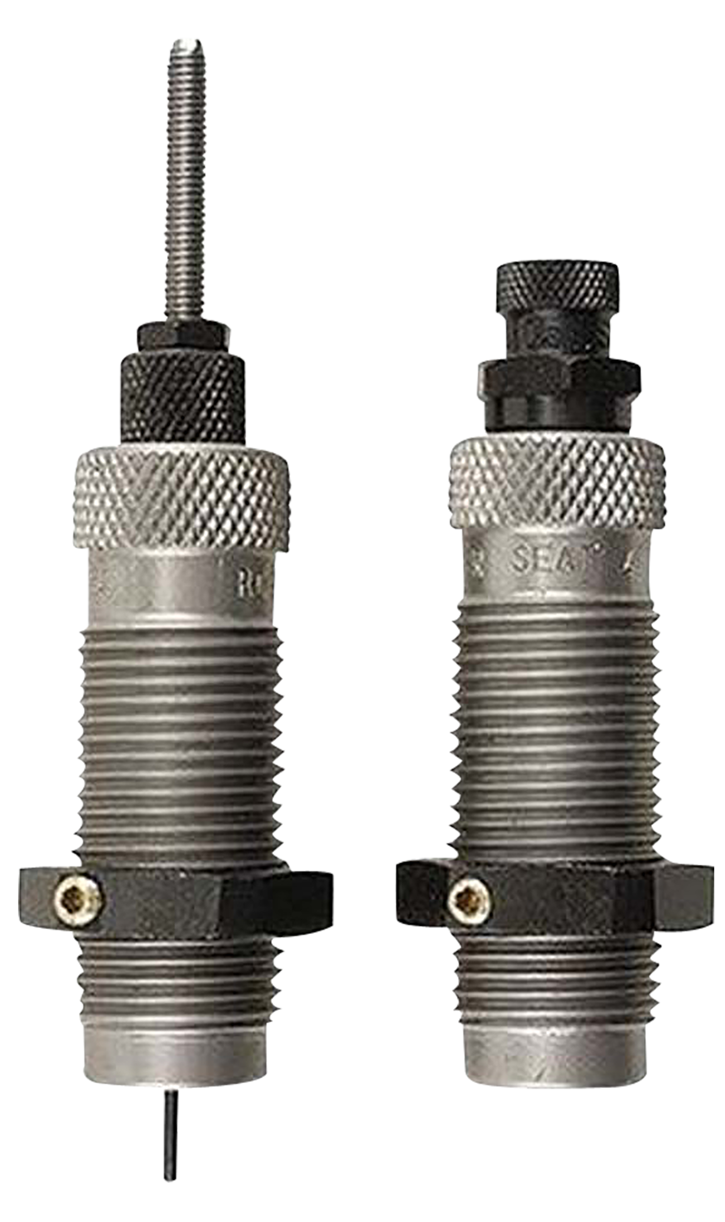 This two-die set is intended for reloading bottleneck cases, and consists of a full-length sizer die with an expander-decapping unit, and a seater die with bullet seater plug.The full-length sizer die brings the case to saami minimum cartridge dimensions.It sizes the outside of the case, de-primes and expands the neck to accept the bullet.The die has vents to prevent case damage caused by trapped air and for excessive lubricant.Headspace is held to minimum tolerances to avoid changing the case body length during full length sizing.The included seater die has a built-in roll crimper to secure the bullet at the same time as it's seated.