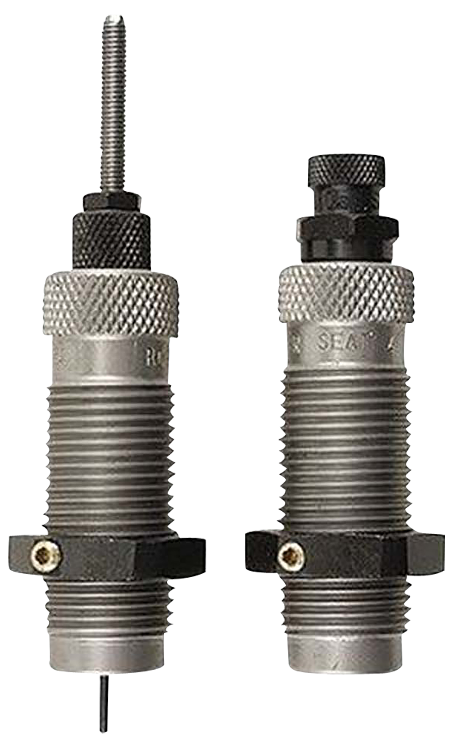 This two-die set is intended for reloading bottleneck cases, and consists of a full-length sizer die with an expander-decapping unit, and a seater die with bullet seater plug.The full-length sizer die brings the case to saami minimum cartridge dimensions.It sizes the outside of the case, de-primes and expands the neck to accept the bullet.The die has vents to prevent case damage caused by trapped air and for excessive lubricant.Headspace is held to minimum tolerances to avoid changing the case body length during full length sizing.The included seater die has a built-in roll crimper to secure the bullet at the same time as it's seated.