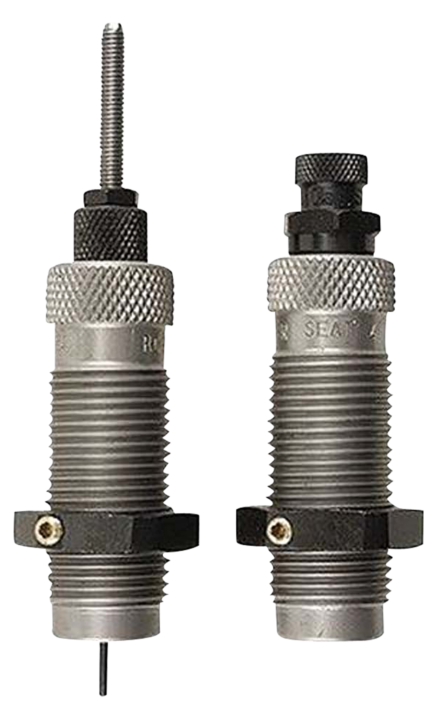 This two-die set is intended for reloading bottleneck cases, and consists of a full-length sizer die with an expander-decapping unit, and a seater die with bullet seater plug.The full-length sizer die brings the case to saami minimum cartridge dimensions.It sizes the outside of the case, de-primes and expands the neck to accept the bullet.The die has vents to prevent case damage caused by trapped air and for excessive lubricant.Headspace is held to minimum tolerances to avoid changing the case body length during full length sizing.The included seater die has a built-in roll crimper to secure the bullet at the same time as it's seated.