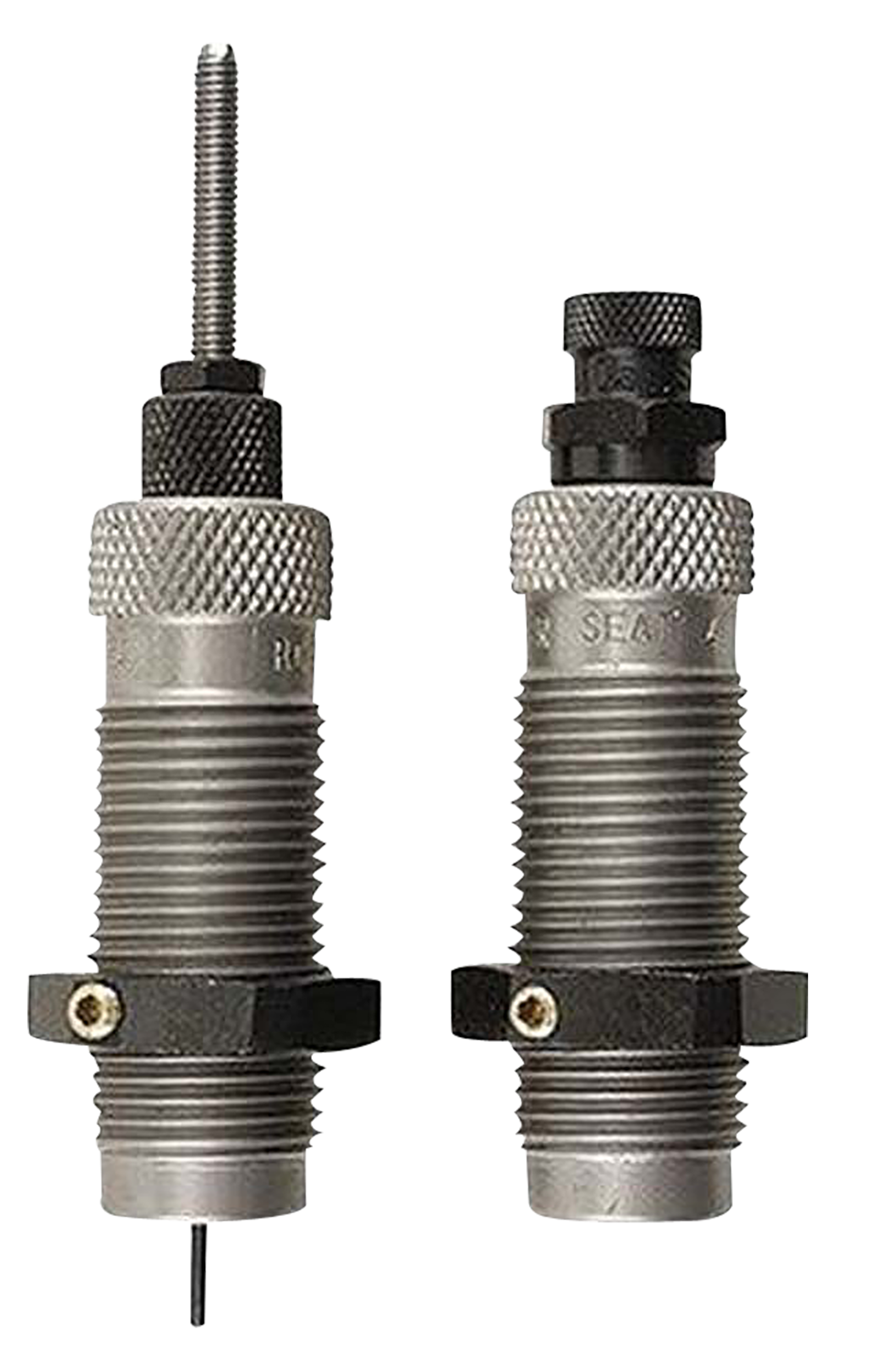 This two-die set is intended for reloading bottleneck cases, and consists of a full-length sizer die with an expander-decapping unit, and a seater die with bullet seater plug.The full-length sizer die brings the case to saami minimum cartridge dimensions.It sizes the outside of the case, de-primes and expands the neck to accept the bullet.The die has vents to prevent case damage caused by trapped air and for excessive lubricant.Headspace is held to minimum tolerances to avoid changing the case body length during full length sizing.The included seater die has a built-in roll crimper to secure the bullet at the same time as it's seated.