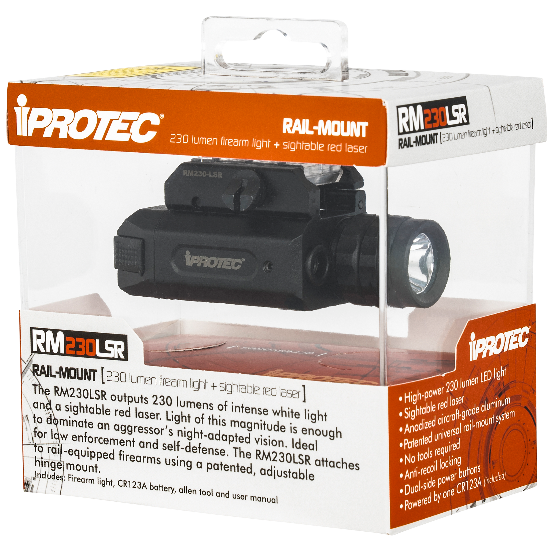The rm230lsr is a rail-mounted firearm combo that features 230 lumens of intense white light and a red laser sight.Light of this magnitude is enough to dominate an aggressor's night-adapted vision; ideal for military, law enforcement and self-defense.The included adjustable hinge mount design is ideal for rail-equipped pistols and long guns.It does not fit subcompacts.