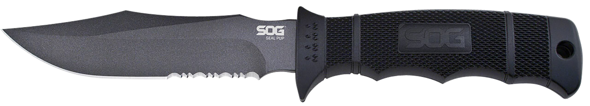 Like its big brother, the seal pup has a partially serrated blade that is powder coated for low-reflection and corrosion resistance.Its lightweight, glass-reinforced nylon (grn) handle features a raised diamond pattern for secure gripping in inclement weather.Includes kydex sheath and lanyard.