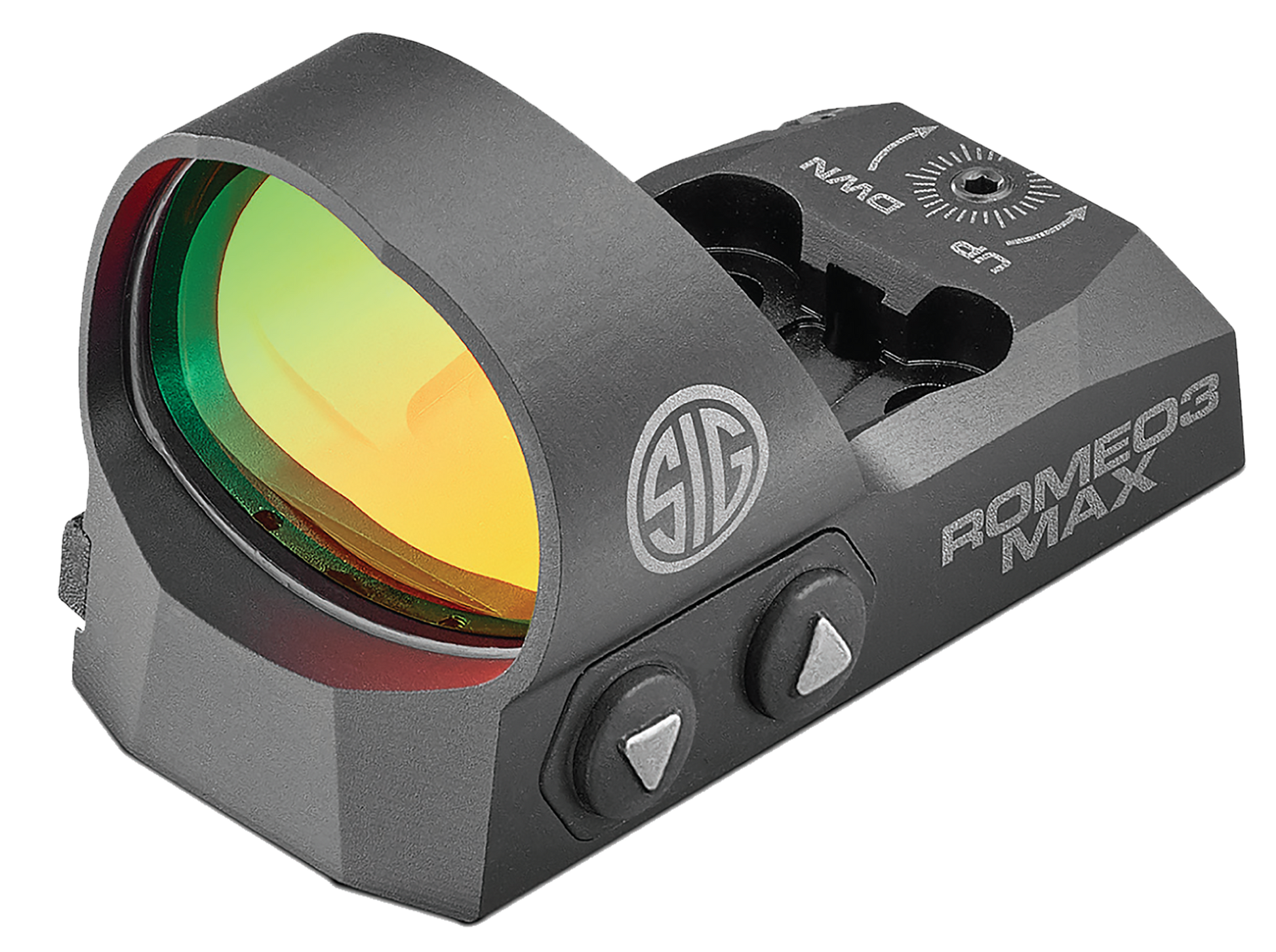 Sig's romeo3max is a compact, open reflex sight features a 30mm wide, round lens for superior field-of-view, a special red-notch filter for vivid red dot and unrivaled optical clarity, with a 3 moa dot size for rapid target engagement, twelve illumination intensity levels, motac activation, and up to 20,000 hours of runtime.