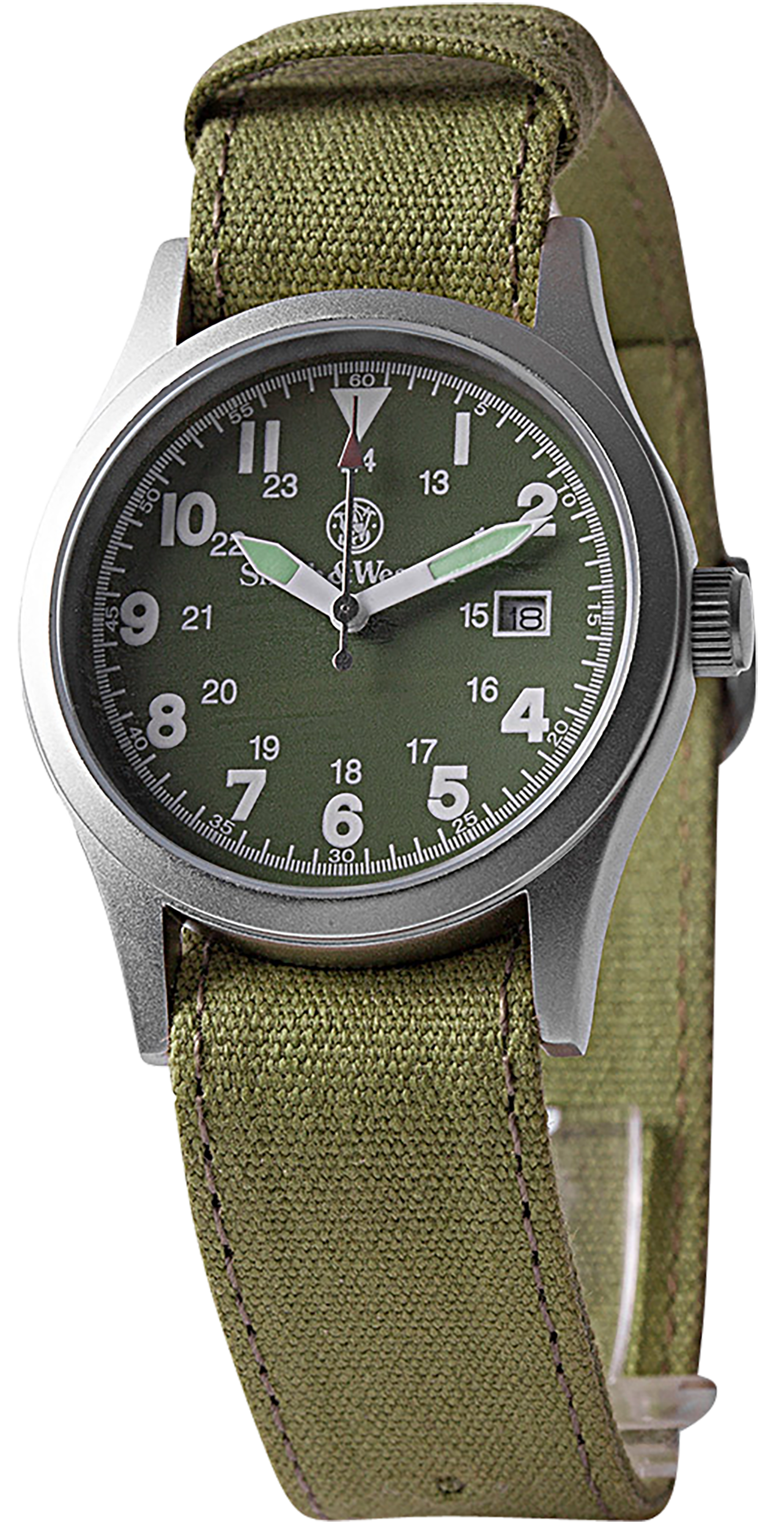 Slide your hand into the bold style and sophistication of the smith & wesson military watch that features a round black face, smith & wesson logo, and 3 interchangeable sturdy canvas straps (black, tan, and olive drab).Crafted with all the precision and reliability that's made smith & wesson a staple in the law enforcement community, with a look and feel befitting all your off-the-clock escapades! equal parts sturdy and stylish, its all the watch you want, with the attention to detail and performance that you've come to expect from smith & wesson, for a price you'll love! this watch features precision quartz japanese movement and includes 3 hands to show the hours, minutes and seconds, date display, and a scratch resistant hardened mineral glass crystal that protects the dial.This timepiece is water resistant up to 30-meters (90-feet) and ideal for anyone looking for adventure, sport or any daily rugged outdoor activity.The smith & wesson men's smw-r1464-bk military basic round black face watch comes with a 1-year limited warranty.