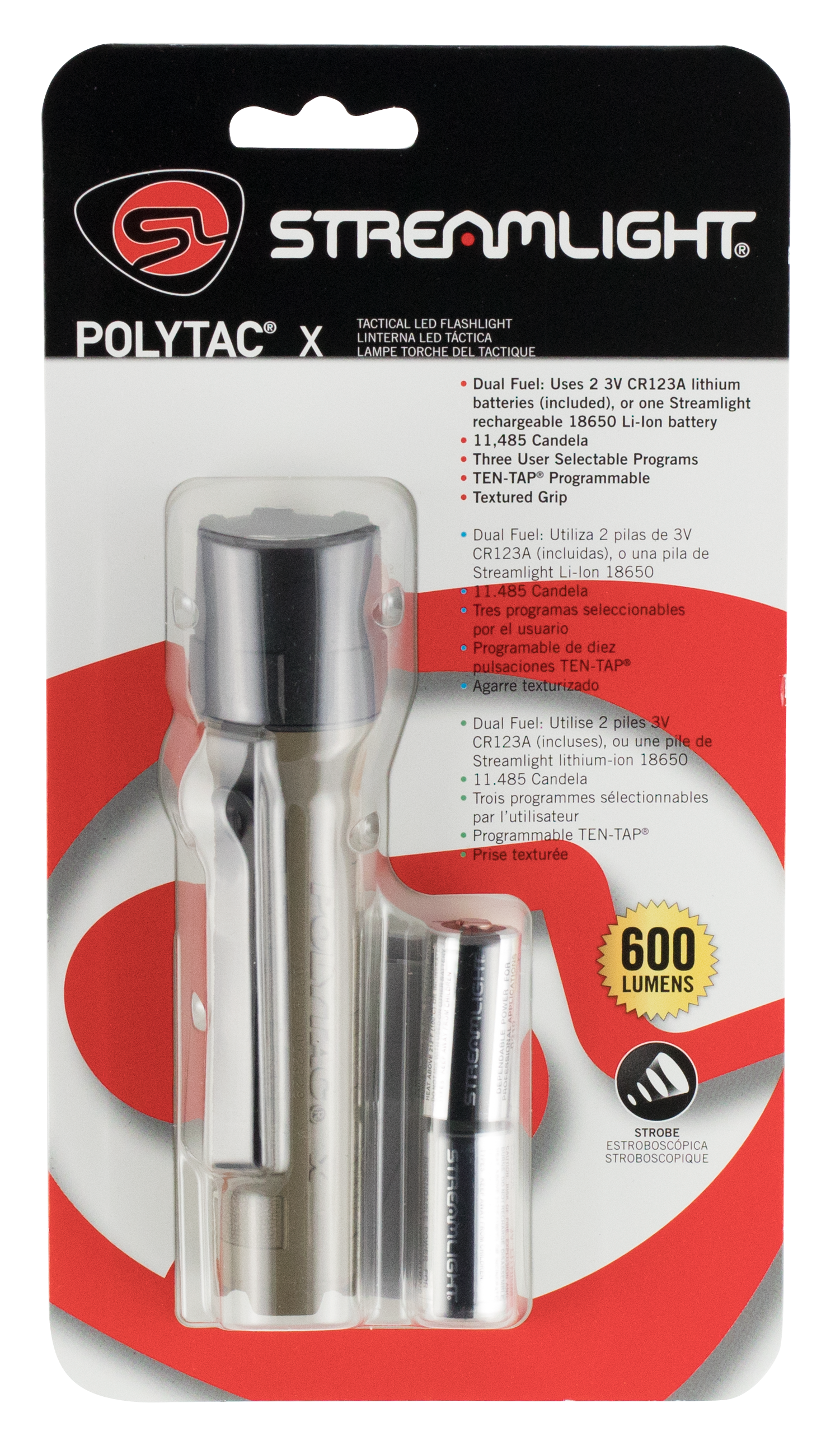 The polytac x is a 600 lumen tactical light is a bright and compact personal polymer light.The ten-tap programming lets you choose one of three modes of operation: 1- high/strobe/low, 2- high only, 3- low/medium/high.It is constructed of polymer with superior grip texture, o-ring sealed glass lens, and push-button tail switch.Included is a two cr123a batteries and pocket clip.