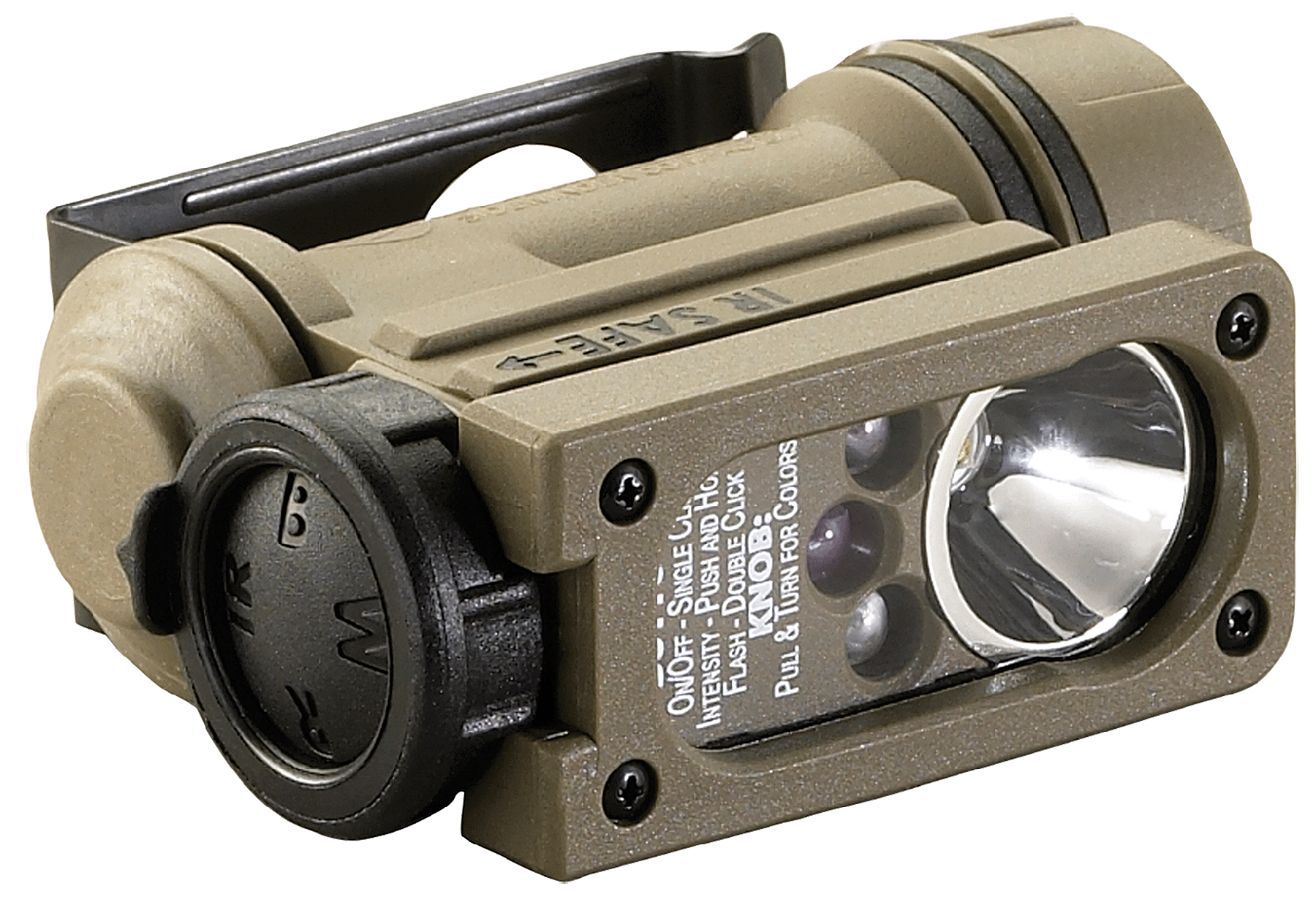 The streamlight sidewinder compact ii is an extremely versatile lighting tool with white light and blue/red and ir color leds for multiple tasks.It is made of high impact super tough nylon polymer with all o-ring sealed openings, 185 degree body rotation, unbreakable scratch-resistant lens and a compound on/off mode selector switch.A rubber dome actuator and 4 position pull-to-turn locking rotary selector knob with ir led tactile indicator provides easy operation even when wearing heavy gloves.Included is one aa alkaline battery; also accepts one cr123a or aa lithium battery, and a helmet mount and elastic head strap.