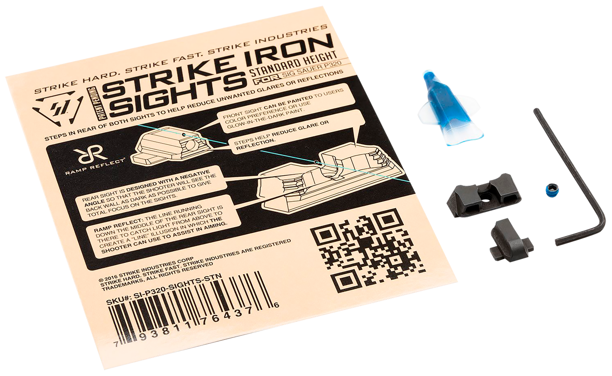 Designed to help with proper sight alignment and keep the shooter's eyes focused, there is natural light that is seen on both sides of the front sight between the u-notch rear sight.Steps placed in the rear of both sights help angle and reduce unwanted glares or reflections out of your eyes.Lines and angles designed to use natural light reflections and shadow play to keep user's eye aligned and focused on the target.The rear sight is designed with a negative angle so that the shooter will see the back wall as dark as possible to give total focus on the sights.The front sight can be painted to users color preference or use glow-in-the-dark paint to customize the look and use of the sights.Made from sus630 hardened stainless steel, the strike iron sights (standard height) is engineered to be as robust as possible while giving you one of the most budget friendly options on the market.