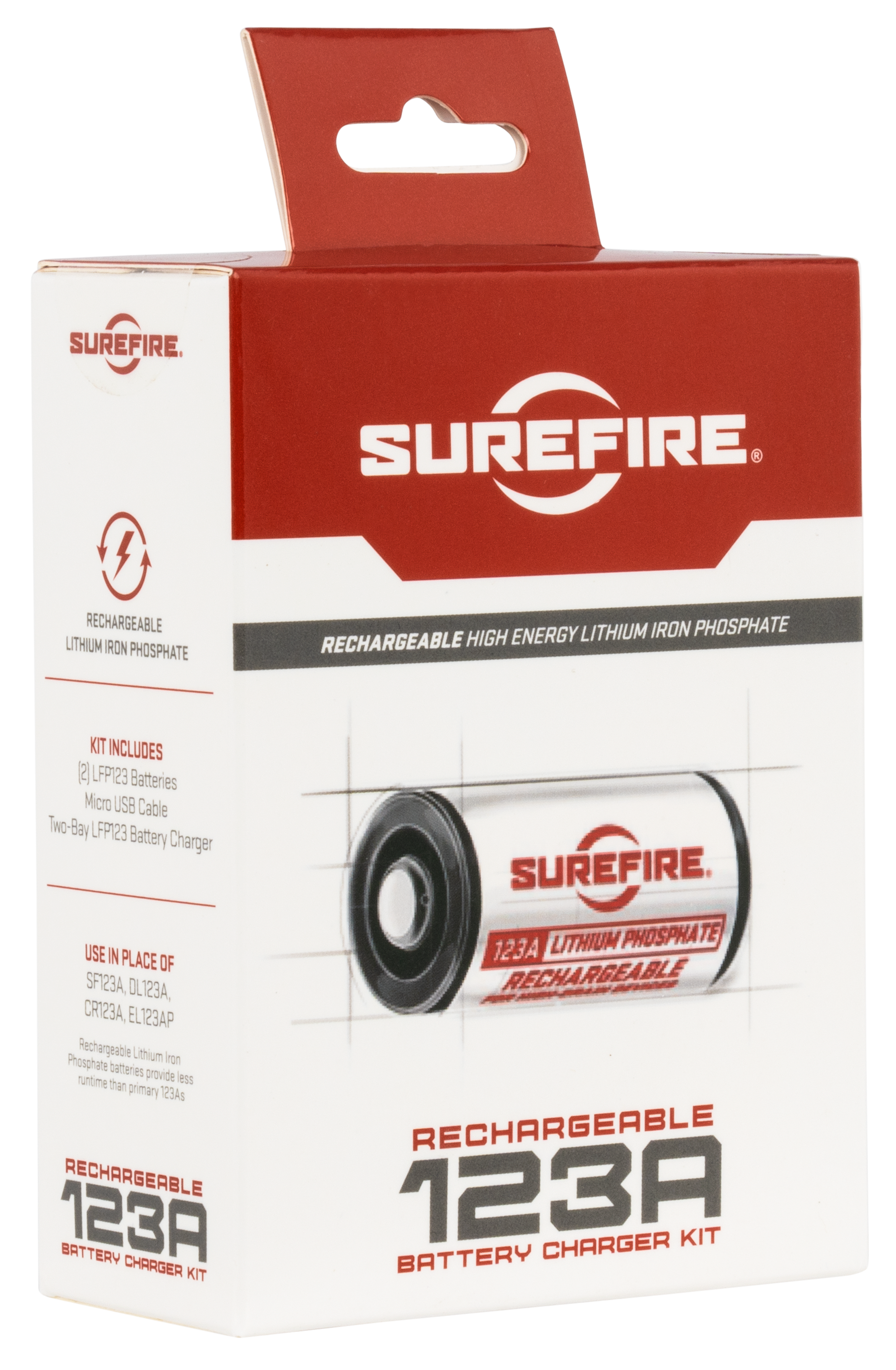 The rechargeable surefire ac/dc wall charger kit includes two lfp123 batteries, micro usb cable, and two-bay lfp123 battery charger.