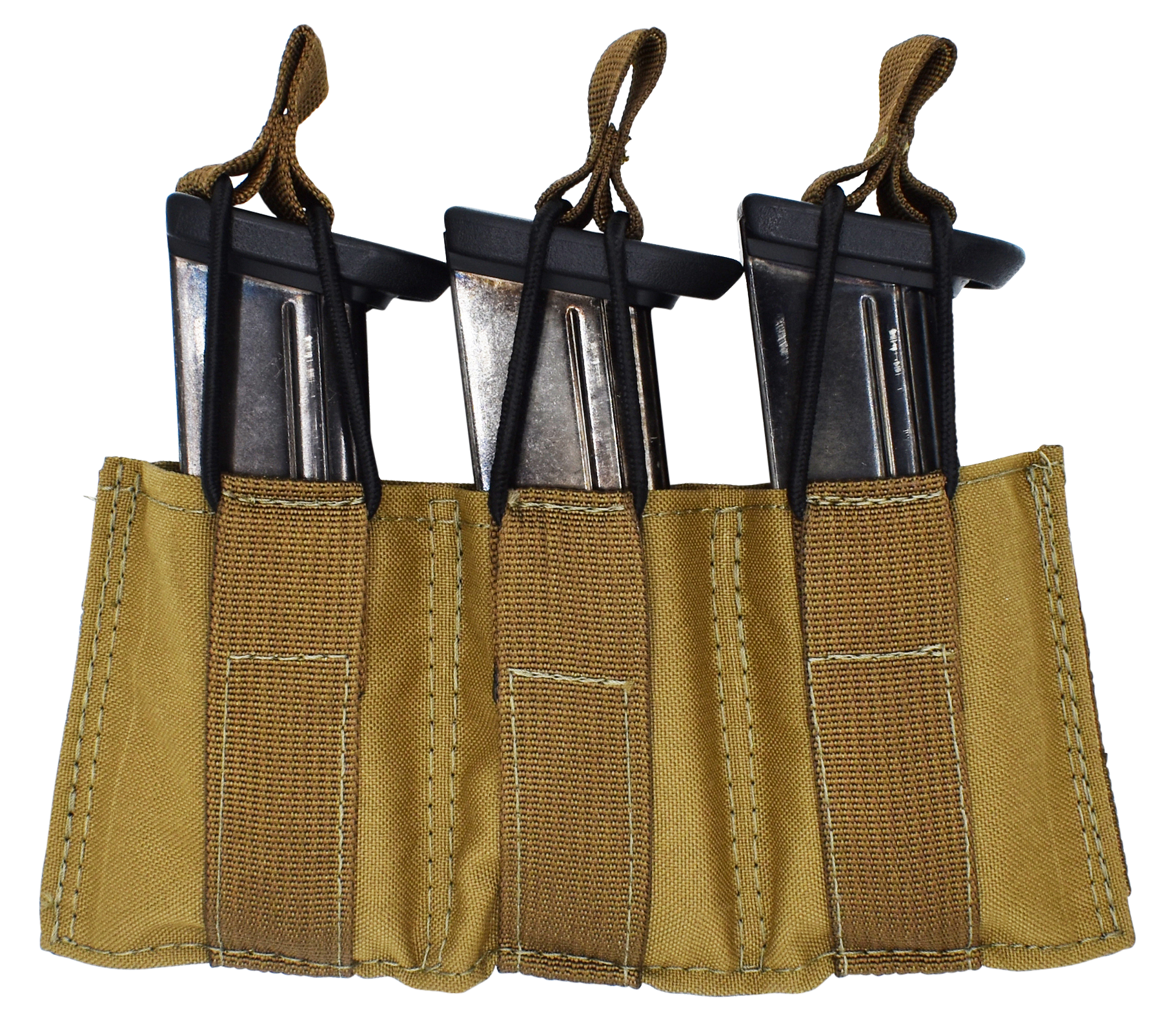 Triple speed load molle pistol magazine pouch is designed with durability and fast reloading of your pistol in mind.Constructed with tough 1000 denier nylon exterior and blackened grommets that serve as convenient drain holes.Magazines are retained with top quality elastic cords and convenient pull tabs.Just flip them over when needing quick access when things get fast and furious.