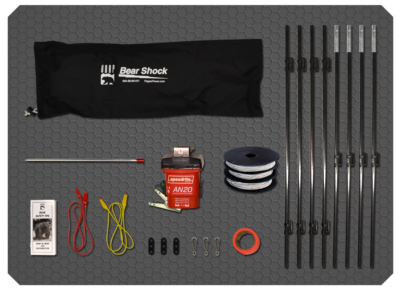Bear shock helps provide safety and peace of mind for you and your family while enjoying the outdoors.This is the original bear shock electric fence.It fits in a 6"x20" storage bag and weighs only 3.7 pounds with batteries.It runs on two (2) d-cell batteries (not included).The batteries will charge the fence for approximately 5 weeks.The complete kit includes: energizer, four fence posts that break down, a hot wire, three electrical poly wires 110ft long, a ground wire, a roll of flagging tape, a ground stake, and storage bag.