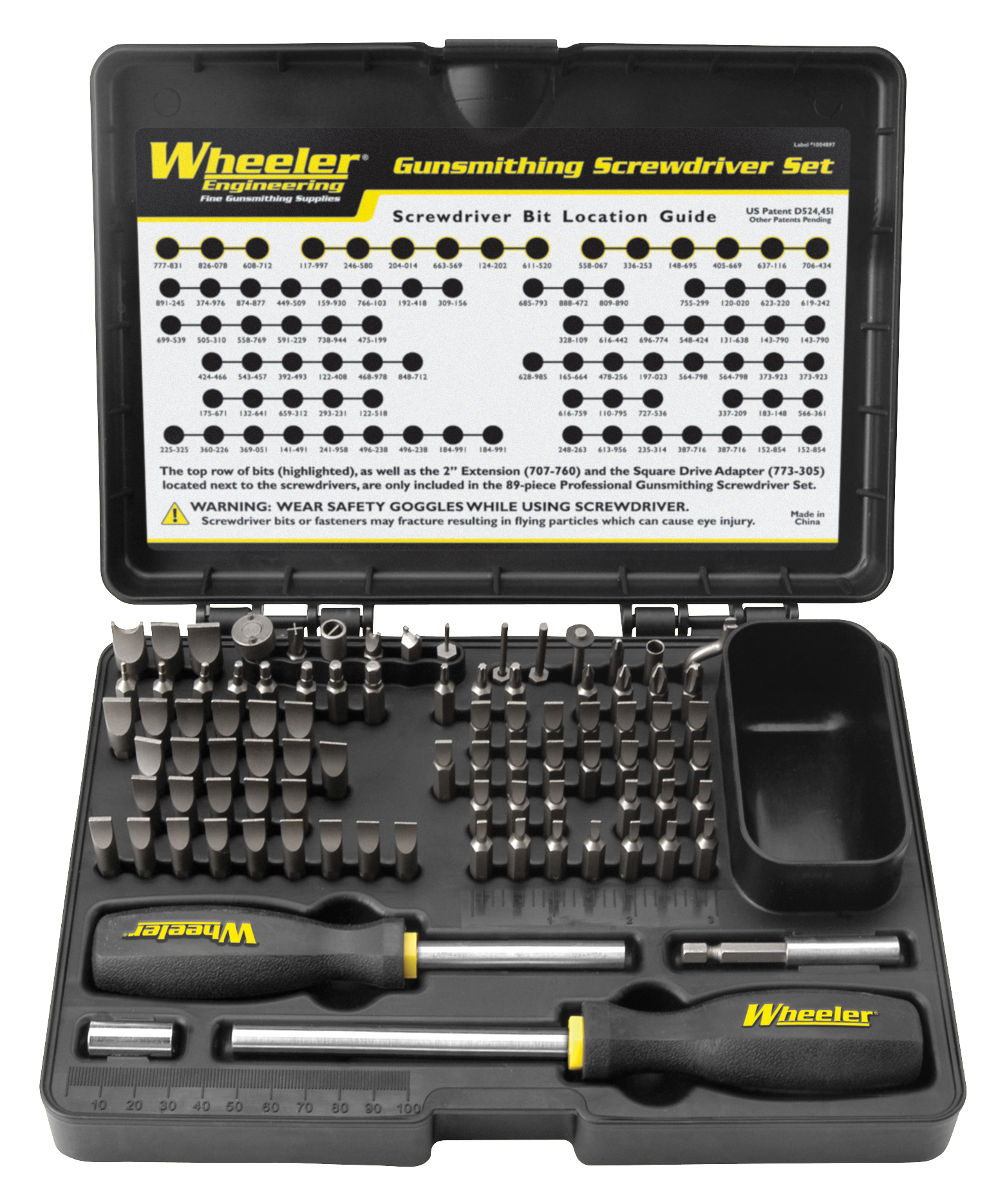 Wheeler's deluxe gunsmithing screwdriver set belongs on every gunsmithing bench.The bits are made from s2 tool steel and hardened to 56-58 rockwell "c".The 54 hollow-ground flat bits range in size from.120"x.020" to.360"x.070" and includes doubles in the thinnest sizes.This set includes two each of the very thinnest bits, a complete selection of phillips, allen and torx bits to cover scope rings, bases, recoil pads.The 15 "specialty bits" that are included are great for installing scope bases.The set comes with two handles made from overmolded plastic, a regular size handle that's good for most jobs and a slimmer, shorter "close quarters" handle that is good for finesse work with smaller bits.